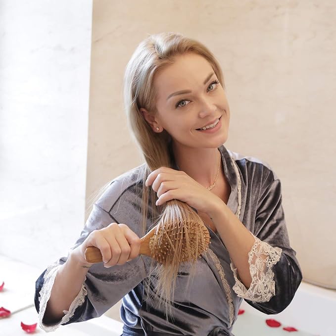 - DETANGLING: Our Bamboo hair brush with wide-spaced teeth less likely to break the hair when combing, high elasticity rubber bladder reduces the pressure of combing, effectively reduce pain, split ends and breakage.