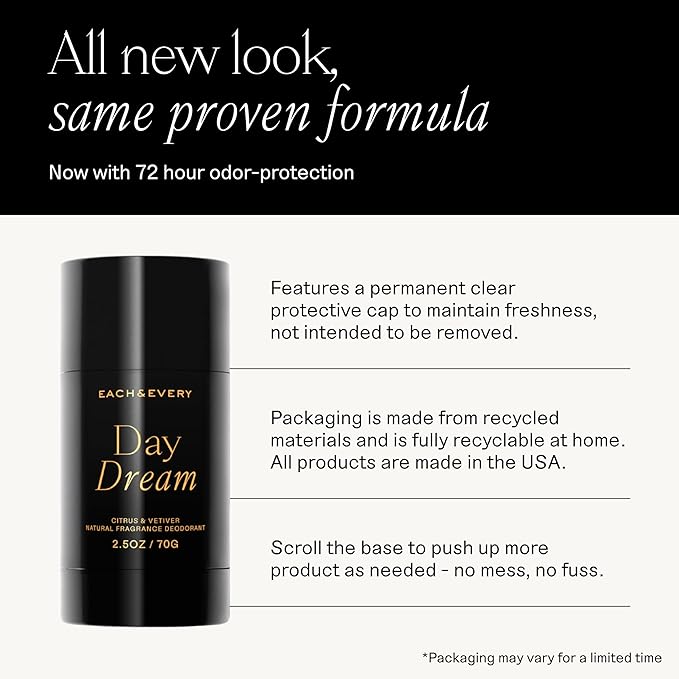 - Day Dream - Escape the ordinary with notes of earthy, grounding vetiver and bright, invigorating citrus. Meanwhile, plush tapioca starch and conditioning coconut oil give this sensitive skin deodorant a smooth glide.